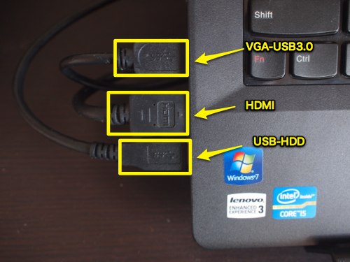 Thinkpad Edge E430CにディスプレイアダプタとHDMIケーブル、外付けHDDを刺すとこんな具合です。