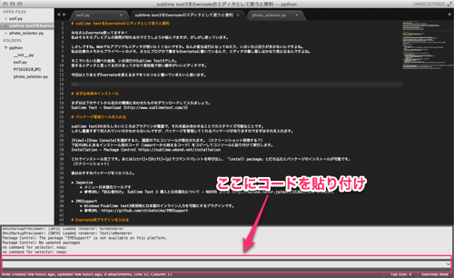 私の環境だけかもしれませんが、sublime text3の最新であるbuild 3065にバージョンアップしたところ、Evernoteのプラグインが動かなくなりました。新規にインストールしても同様です。