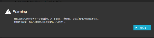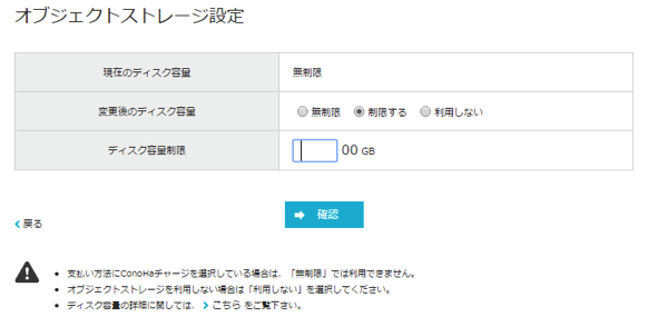 ただし支払い方法がconoHaチャージだと容量無制限が選べません。