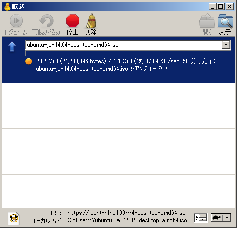 conoHaのオブジェクトストレージにアップロードのテスト。ubuntu14.04のISOイメージ(1.1GB)が1時間弱か。いいんじゃないでしょか。