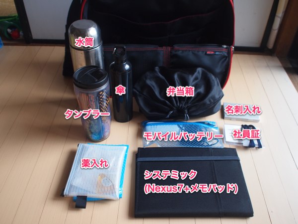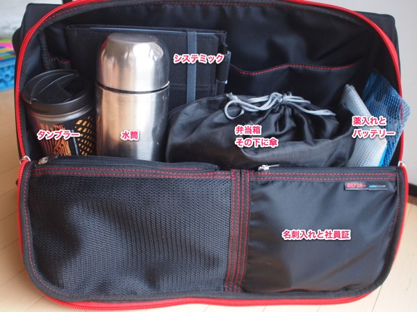 中に入れているものはだいたいこれでオールスター。タンブラーが減ったり弁当箱がなかったりくらいですね。