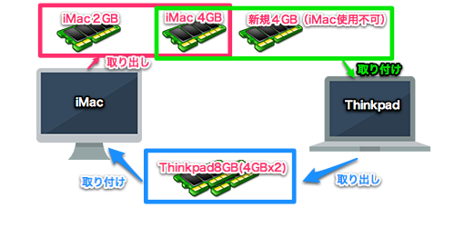 iMacからメモリを取り出して、4GBx2をThinkpadに取り付け。そしてThinkpadのメモリをiMacに取り付けるという流れです。