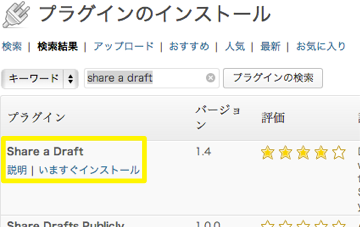WordPressの管理画面で、プラグイン>新規追加を選び、”share a Draft”で検索すると、該当のプラグインが見つかります。