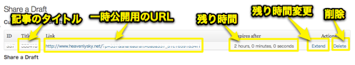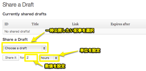 プラグインが有効かされていると、管理画面の投稿メニューに”share a Draft”が追加されます。それを選択します。